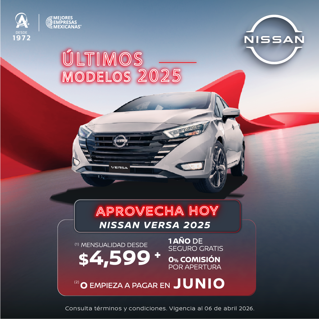 Se aplica para VERSA SENSE TM 25 en plan tradicional CrediNissan. Tasa anual de 11.12% y CAT promedio sin IVA de 12.5%. (2) Aplica para VERSA ADVANCE CVT '25 en operaciones de crédito celebradas con CrediNissan. No aplica con otras promociones ni en compra de flotillas. Para conocer planes y modalidades de crédito, verificar precios, requisitos de contratación, comisiones, disponibilidad, términos y condiciones, consulta a tu Distribuidor Autorizado Nissan. Vigencia al 6 de abril de 2026.