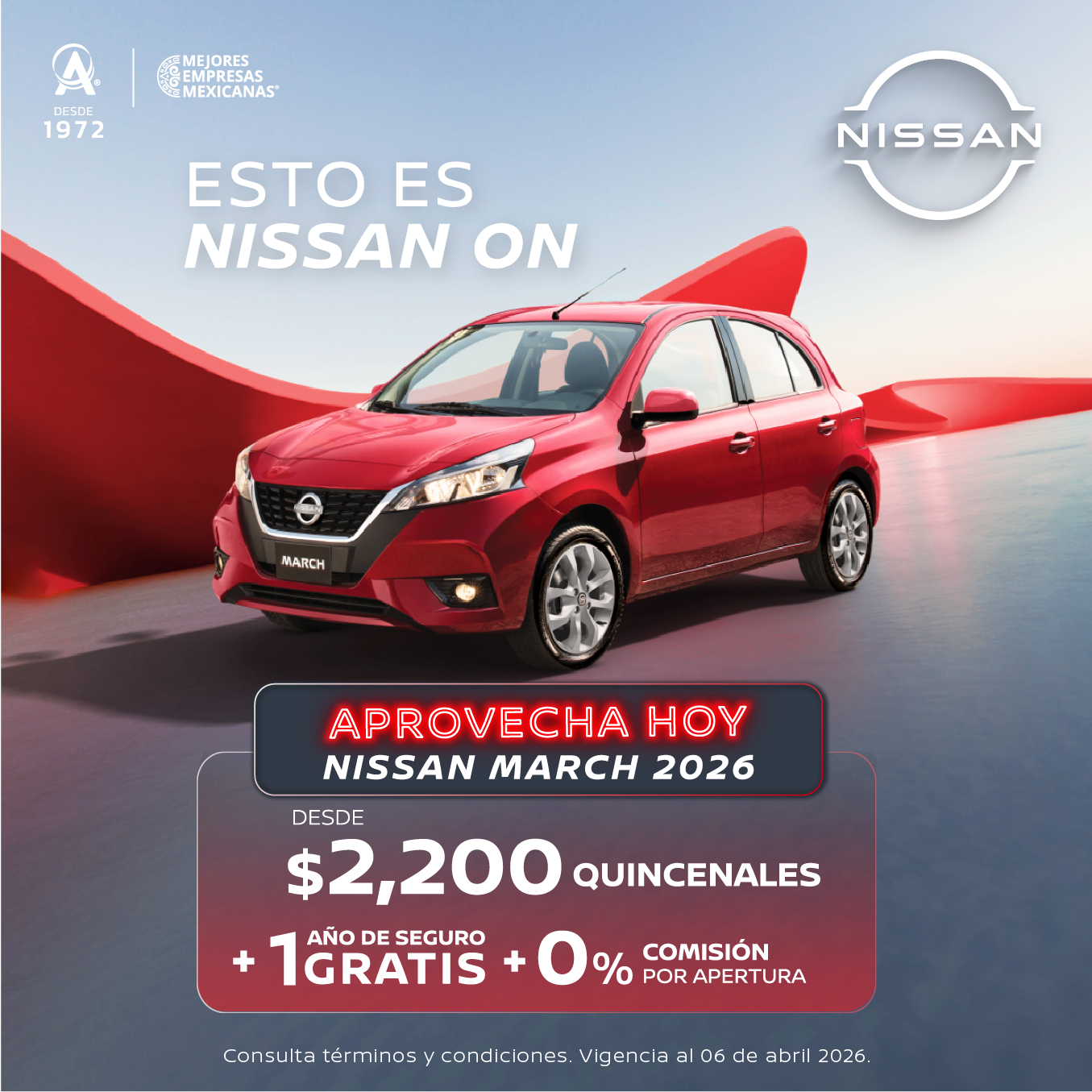 Se aplica para MARCH SENSE TM 26 en plan tradicional CrediNissan con el 40% de enganche a 72 meses, 1 año de seguro gratis y 0% comisión por apertura. Tasa anual de 16.69% y CAT promedio sin IVA de 18.9%. No aplica con otras promociones ni en compra de flotillas. Para conocer planes y modalidades de crédito, verificar precios, requisitos de contratación, comisiones, disponibilidad, términos y condiciones, consulta a tu Distribuidor Autorizado Nissan. Vigencia al 6 de abril de 2026.