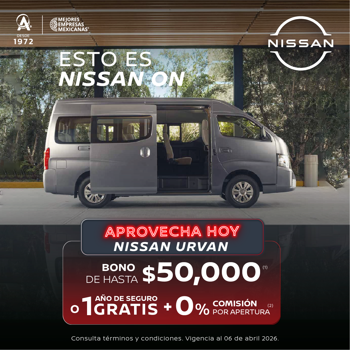 Se aplica para URVAN 11 PASAJEROS AA '25 en operaciones de contado. (2) Aplica para todas las versiones Urvan 2025 en operaciones de contado o en operaciones de crédito celebradas con Credi Nissan. No aplica con otras promociones ni en compra de flotillas. Para conocer planes y modalidades de crédito, verificar precios, requisitos de contratación, comisiones, disponibilidad, términos y condiciones, consulta a tu Distribuidor Autorizado Nissan. Vigencia al 6 de abril de 2026