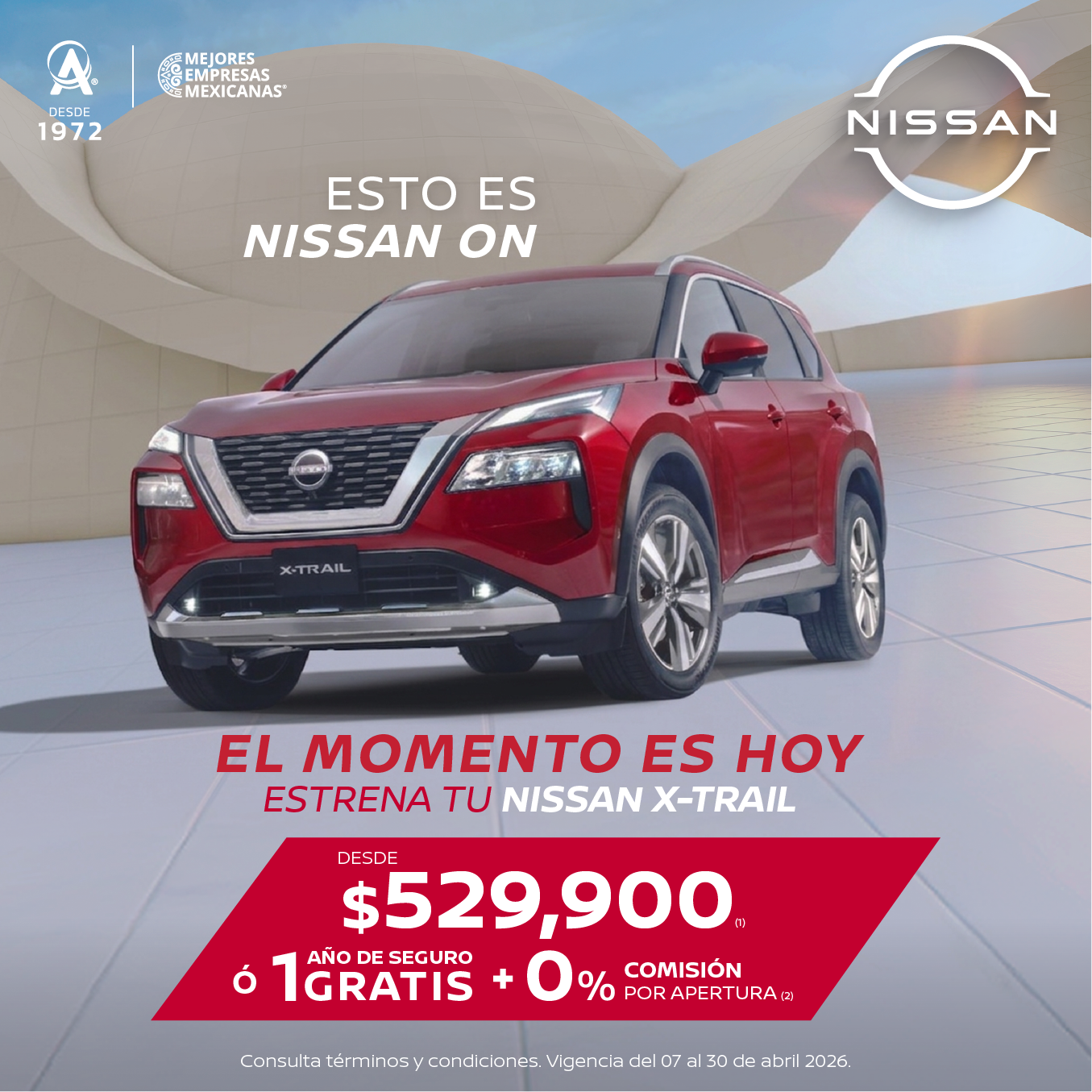 Aplica en la versión XTRAIL ADVANCE 2 ROW '26 en operaciones de crédito celebradas con Credi Nissan. (2) Aplica para todas las versiones Xtrail 2026 en operaciones de crédito celebradas con Credi Nissan. No aplica con otras promociones ni en compra de flotillas. Para conocer planes y modalidades de crédito, verificar precios, requisitos de contratación, comisiones, disponibilidad, términos y condiciones, consulta a tu Distribuidor Autorizado Nissan. Vigencia del 07 al 30 de abril 2026.